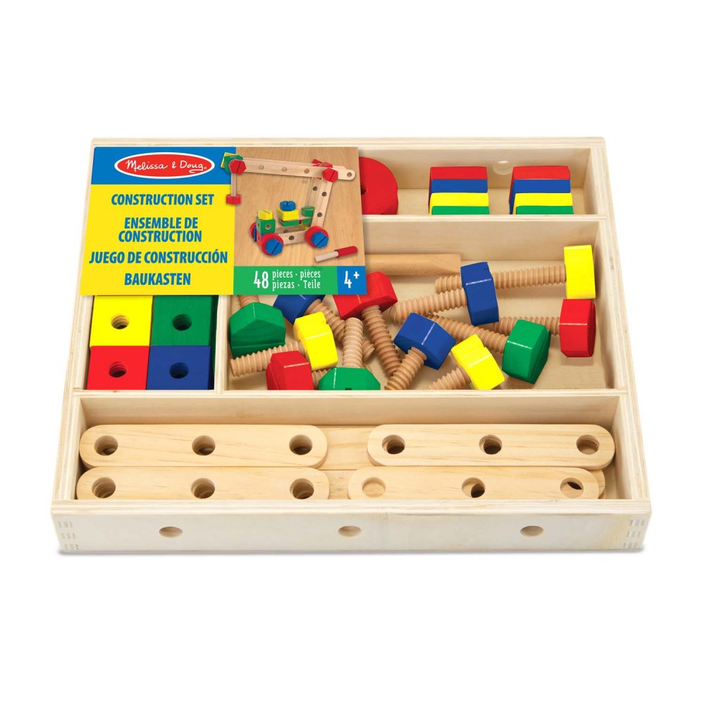 Kinderen kunnen zelf van alles in elkaar zetten met deze houten constructieset! Met de boutjes en moertjes kunnen de onderdelen aan elkaar worden bevestigd om iets moois te maken. In de opbergdoos zitten ook gaten, dus die kan ook in de creaties worden gebruikt!