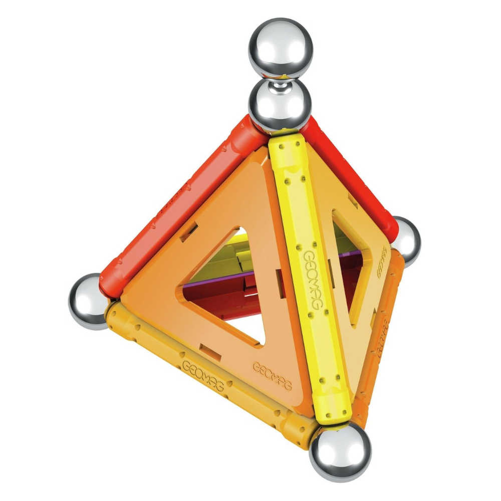 Deze kleine Geomag set bevat 6 staven in regenboogkleuren, 5 metalen ballen en 4 driehoeken in de kleuren geel, rood en oranje.
