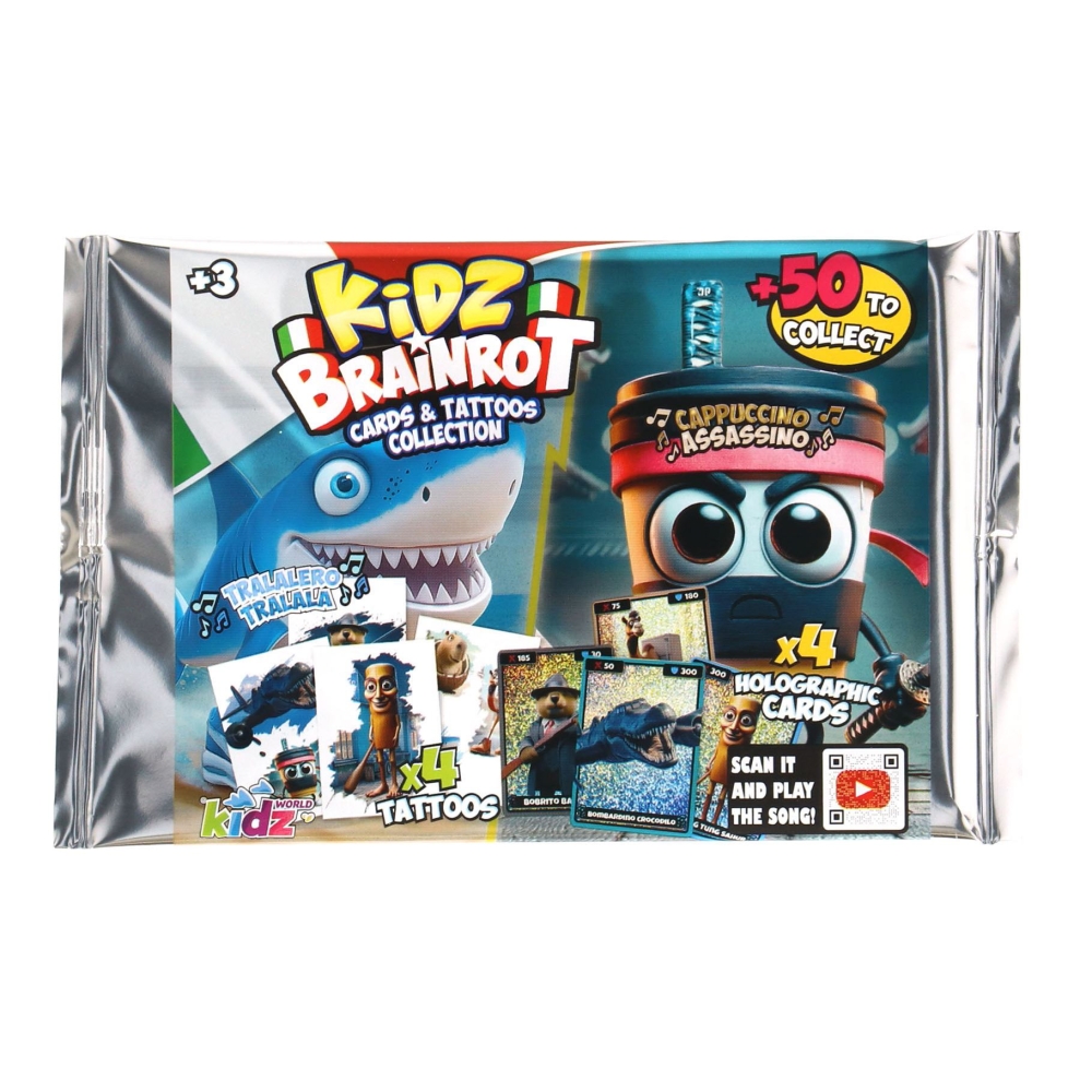 Activeer het denken met Kidz Brainrot holografische kaarten + tattoos