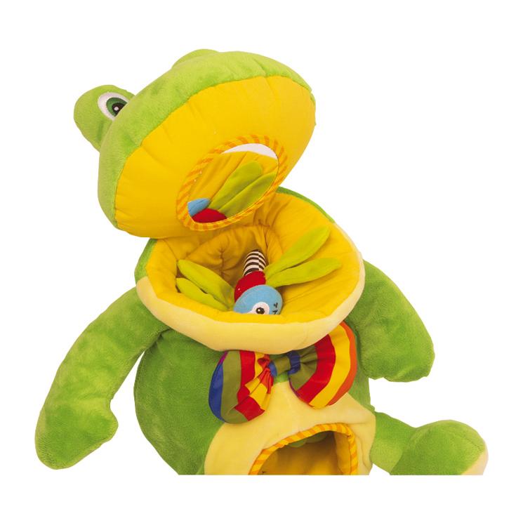 Deze leuke kikker, gemaakt van zachte stof biedt de allerkleinsten onder ons veel mogelijkheden om hun zintuigen en motorische vaardigheden te ontdekken! De kikker heeft rammelaars in zijn voeten en in zijn mond zit zijn prooi verborgen!