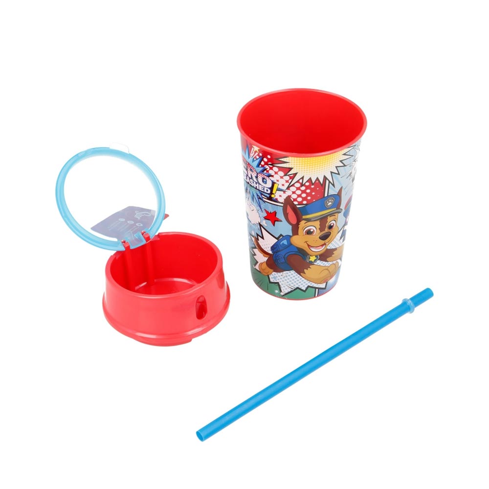 De kunststoffen beker heeft een inhoud van 400 ml. Het bovenste compartiment kan op de beker gedrukt worden en kan gevuld worden met stukjes fruit of een andere snack.