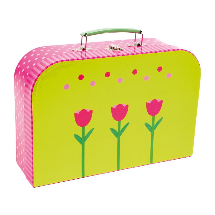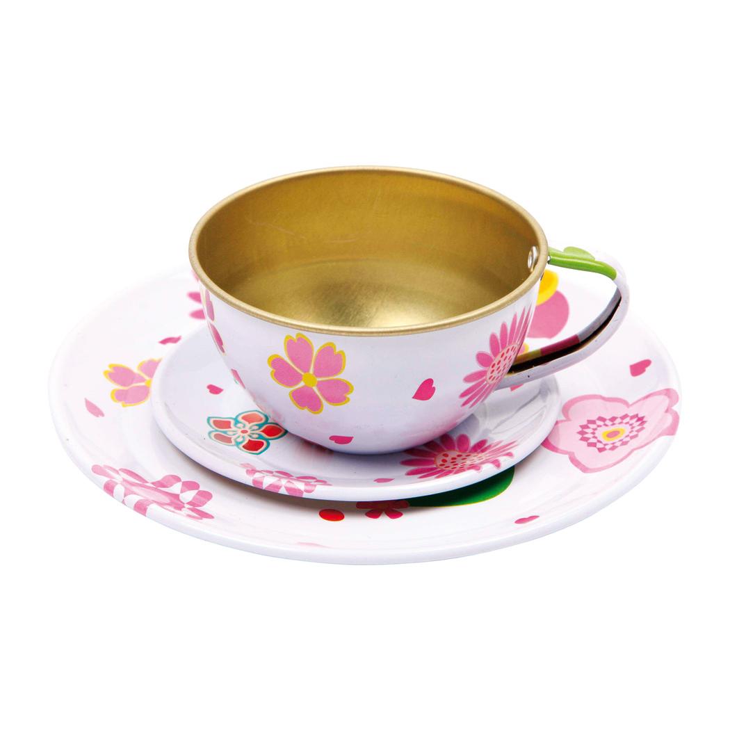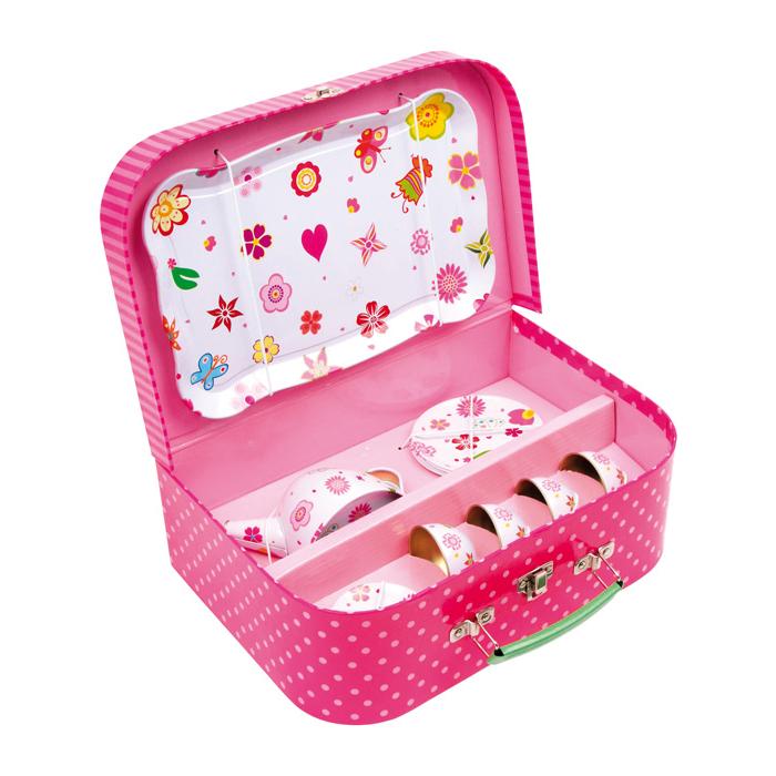 Deze picnickset bestaat uit een dienblad, theepot, vier dessertbordjes en vier kop-en-schotels. Alles is voorzien van een prachtig decor van bloemen en vlinders en is gemaakt van gelakt metaal. Alles kan worden opgeborgen en meegenomen in een kleurrijk versierd koffertje met kliksluiting en handvat. Voor gezellig theeplezier!