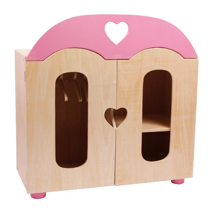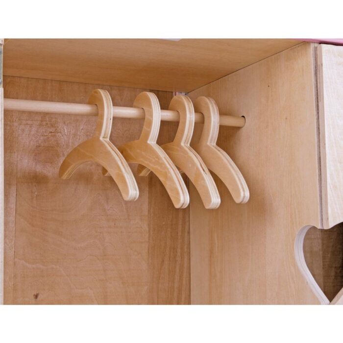 Een fraaie, decoratieve kast voor poppenkleertjes! De deuren zijn voorzien van een greep met een hartjesmotief. De kledingkast is uitgerust met 4 kleerhangers en 2 opbergvakken. Magneten zorgen ervoor dat de deuren gesloten blijven. Een ideale kledingkast om poppenkleren in op te bergen.