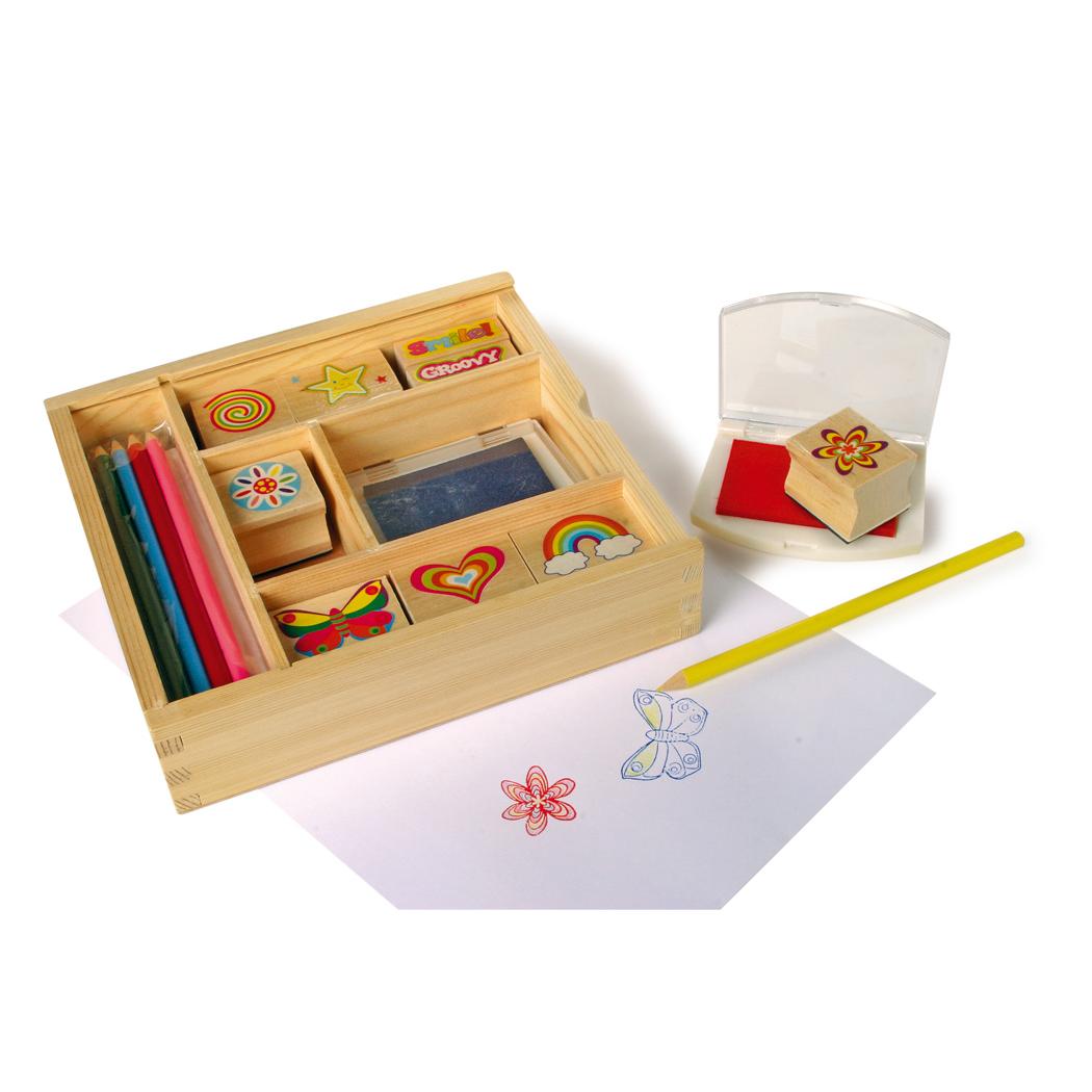 Een bijzonder fraaie houten doos voorzien van 9 stempels, 2 stempelkussens in de kleuren rood en blauw en 5 kleurpotloden. Met deze stempeldoos wordt het voor jou mogelijk om je meest bijzondere tekeningen op te fleuren met allerlei stempel motieven. Gebruik de motieven bijvoorbeeld ook voor het versieren van uitnodigingen of verjaardagskaarten! Na gebruik kunnen alle accessoires netjes worden opgeborgen in de houten doos.